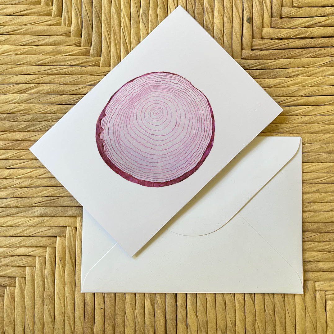 Produce hand drawn with Prismacolor pencil, printed on sustainably sourced 16pt paper, satin finish outside, blank uncoated inside. With envelope, of course.