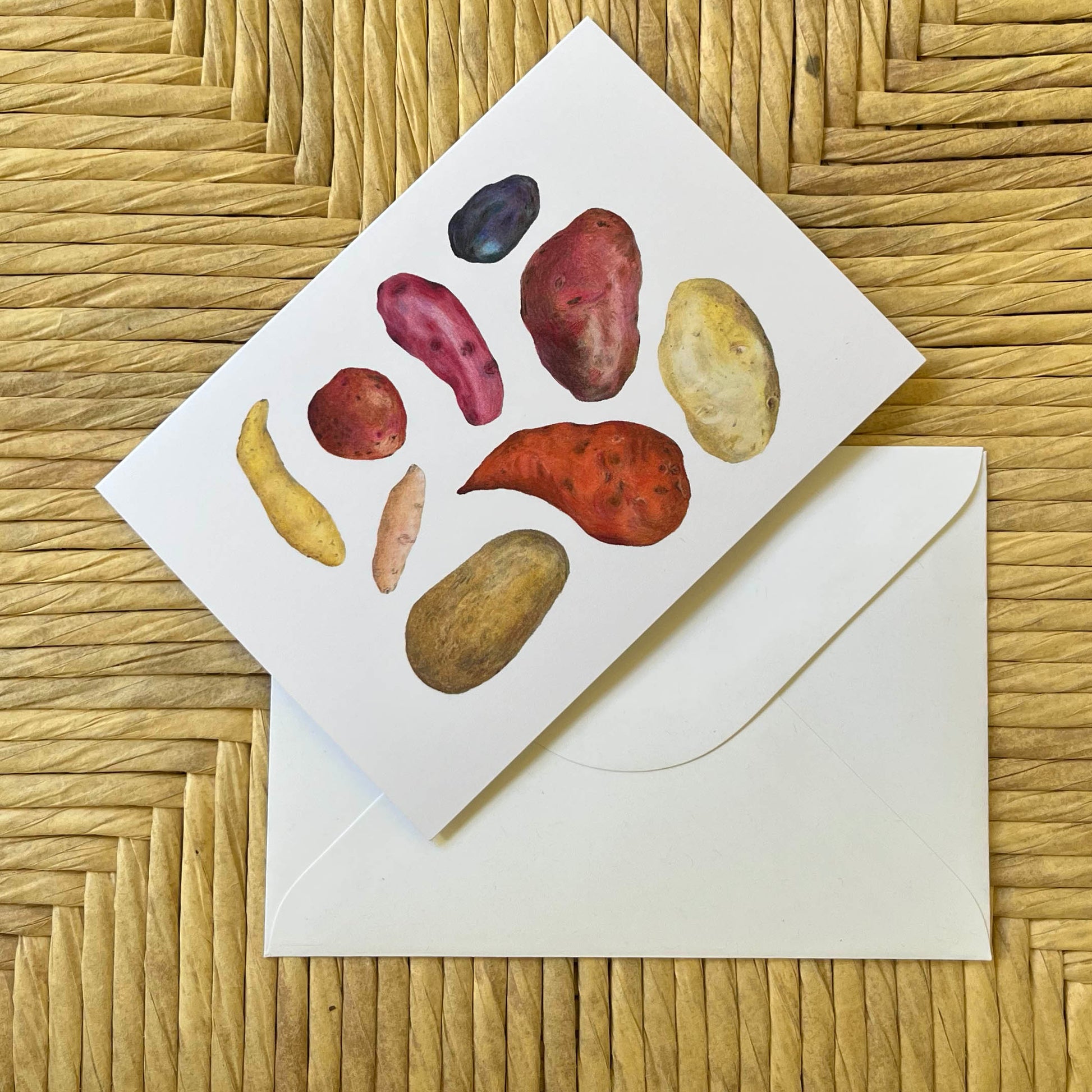 Produce hand drawn with Prismacolor pencil, printed on sustainably sourced 16pt paper, satin finish outside, blank uncoated inside. With envelope, of course.